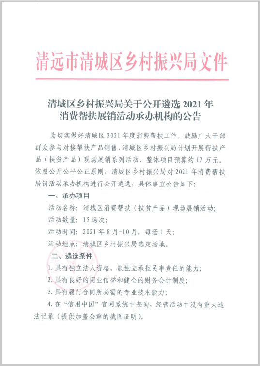 清城區(qū)鄉(xiāng)村振興局關(guān)于公開遴選2021年消費(fèi)幫扶展銷活動(dòng)承辦機(jī)構(gòu)的公告