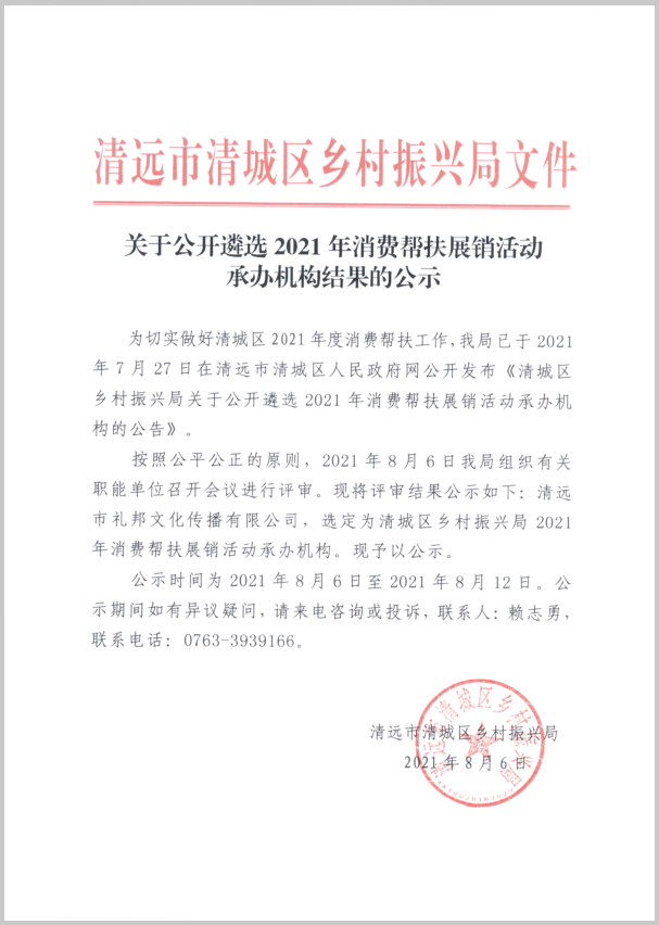 關于公開遴選2021年消費幫扶展銷活動承辦機構結果的公示