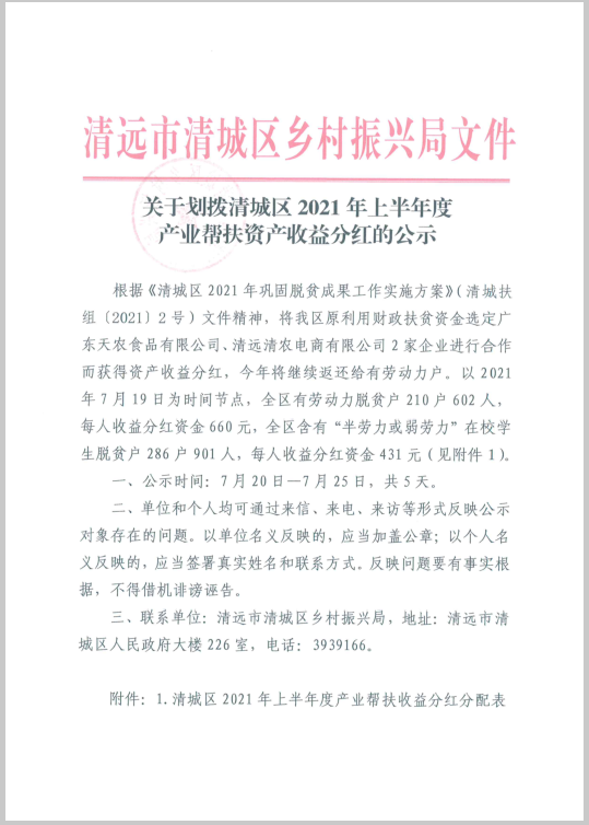 關(guān)于劃撥清城區(qū)2021年上半年度產(chǎn)業(yè)扶貧資產(chǎn)收益分紅的公示