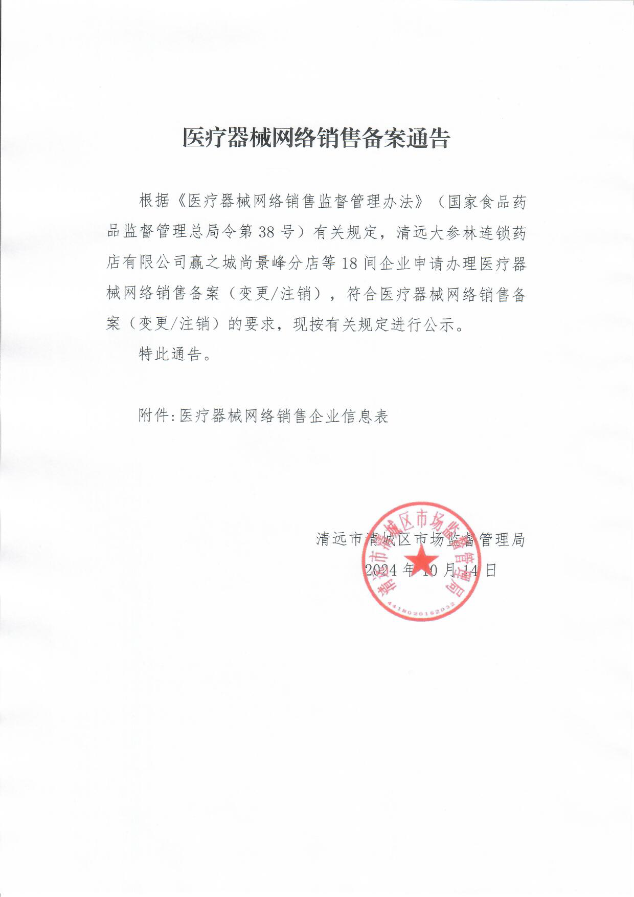 11 | 變更備案 | (清城)網械銷售備字 ﹝2024﹞第175號 | 2024/9/29 | 清遠大參林連鎖藥店有限公司清城維港雅居分店 | 入駐類 | 91441802MA51GUEF8W | 清遠市清城區靜福路6號維港半島花園二十六號樓首層商鋪08號 | ****** | 餓了么;京東到家;美團網;易健康;抖店、抖音電商 | (瀘)網械平臺備字(2018)第00004號,(瀘)網械平臺備字(2018)第00002號,(京)網械平臺備字(2018)第00004號,(粵)網械平臺備字(2022)第00014號,(滬)網械平臺備字(2022)第00002號 | ****** | ****** | ****** | ****** | ****** | ****** |