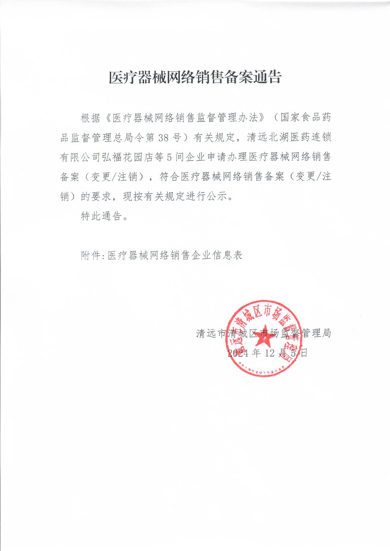 根據《醫療器械網絡銷售監督管理辦法》(國家食品藥品監督管理總局令第38號)有關規定,清遠北湖醫藥連鎖有限公司弘福花園店等5間企業申請辦理醫療器械網絡銷售備案(變更/注銷),符合醫療器械網絡銷售備案(變更/注銷)的要求,現按有關規定進行公示。