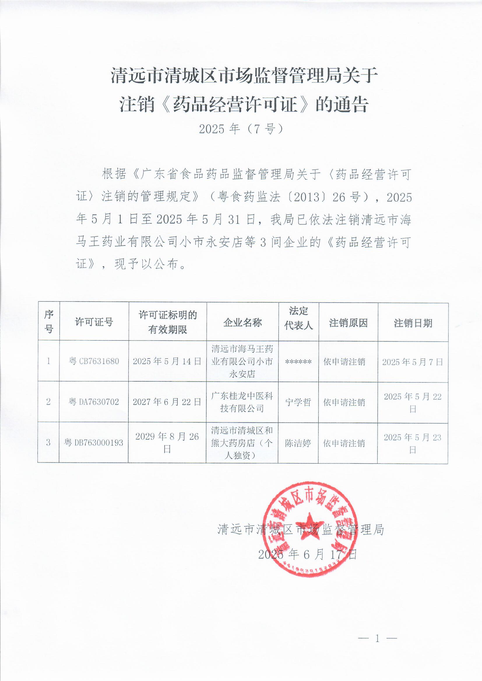 清遠(yuǎn)市清城區(qū)市場(chǎng)監(jiān)督管理局關(guān)于注銷《藥品經(jīng)營(yíng)許可證》的通告(2025年(7號(hào)))