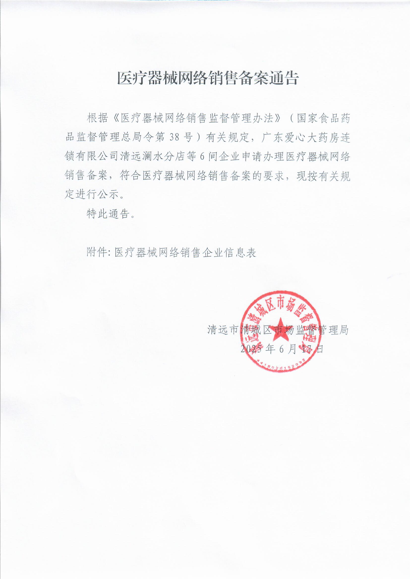 2 | 變更備案 | (清城)網械銷售備字 ﹝2025﹞第24號 | 2025/6/4 | 廣東愛心大藥房連鎖有限公司清遠順盈廣場分店 | 入駐類 | 91441802MA4UTKY19W | 清遠市清城區(qū)人民一路28號順盈時代廣場2-6號首層商鋪1327號 | ****** | 餓了么;美團網;京東到家 | (滬)網械平臺備字[2018]第 00004號;(粵)網械平臺備字(2020)第00014號;(滬)網械平臺備字[2018]第00002號 | 無 | 無 | 無 | 無 | 無 | 無 |