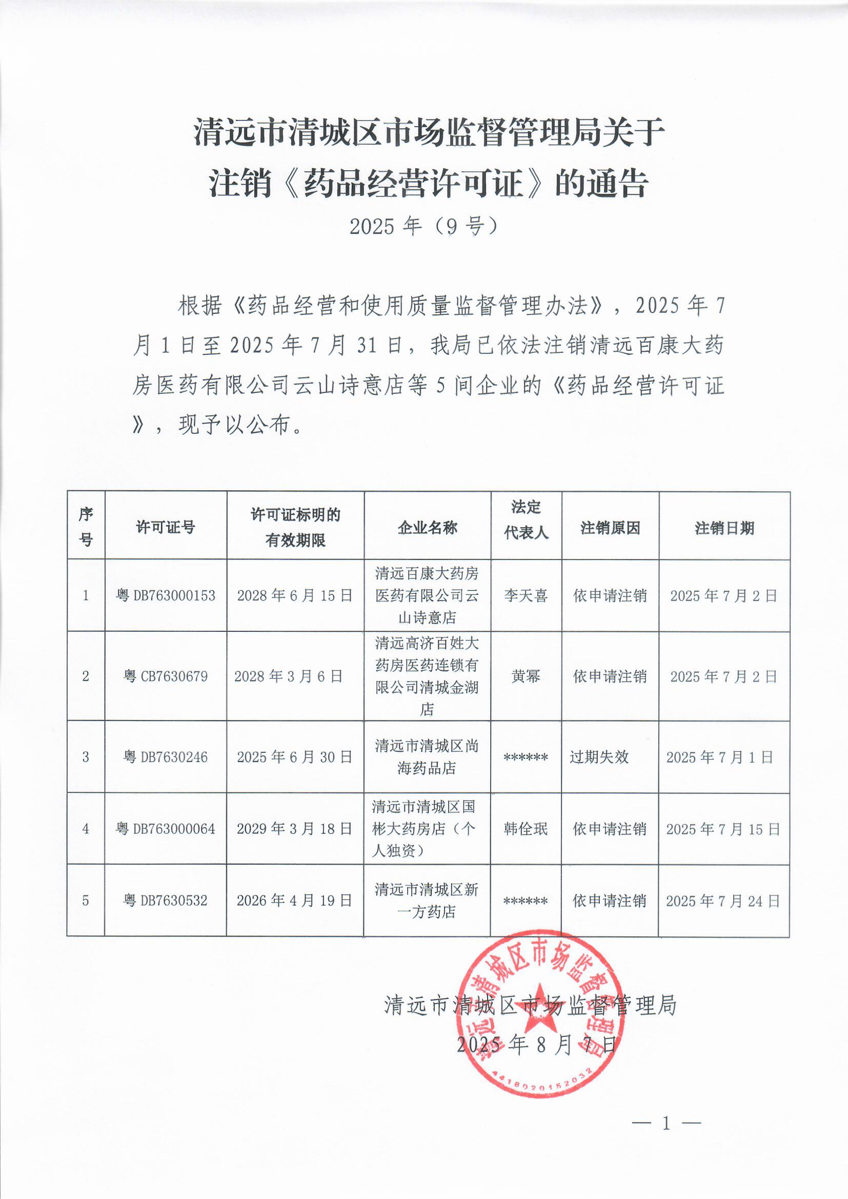 清遠市清城區市場監督管理局關于注銷《藥品經營許可證》的通告