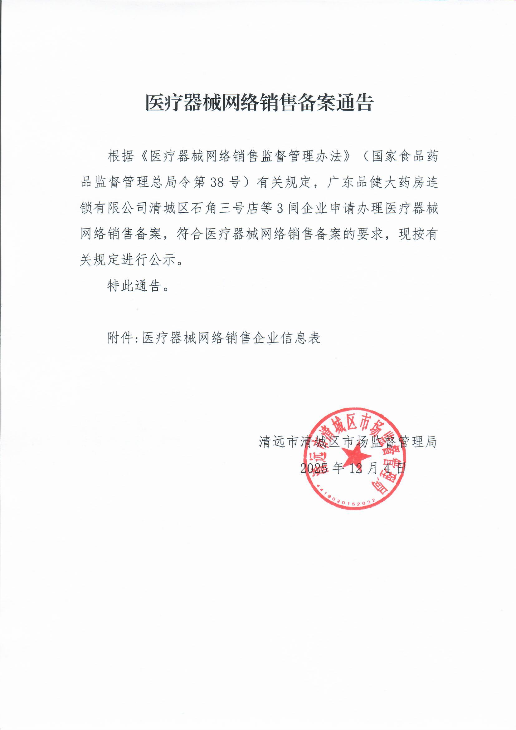 2 | 首次備案 | (清城)網械銷售備字 ﹝2025﹞第48號 | 2025/12/1 | 廣東品健大藥房連鎖有限公司清城區石角三號店 | 入駐類 | 91441802MADE68W87E | 清遠市清城區石角鎮福源街一幢第三號、東十二幢188號 | ****** | 抖店、抖音電商;京東到家;餓了么;美團網;拼多多商城;天貓 | (滬)網械平臺備字[2022]第 00002 號;(滬)網械平臺備字[2018]第 00002 號;(滬)網械平臺備字[2018]第 00004 號;(京)網械平臺備字(2018)第 00004 號;(滬)網械平臺備字[2018]第 00003 號;(浙)網械平臺備字[2018]第 00002 號 | 無 | 無 | 無 | 無 | 無 | 無 |