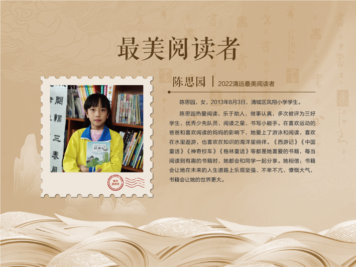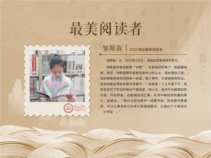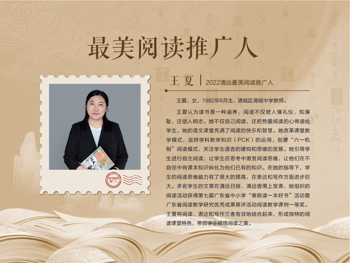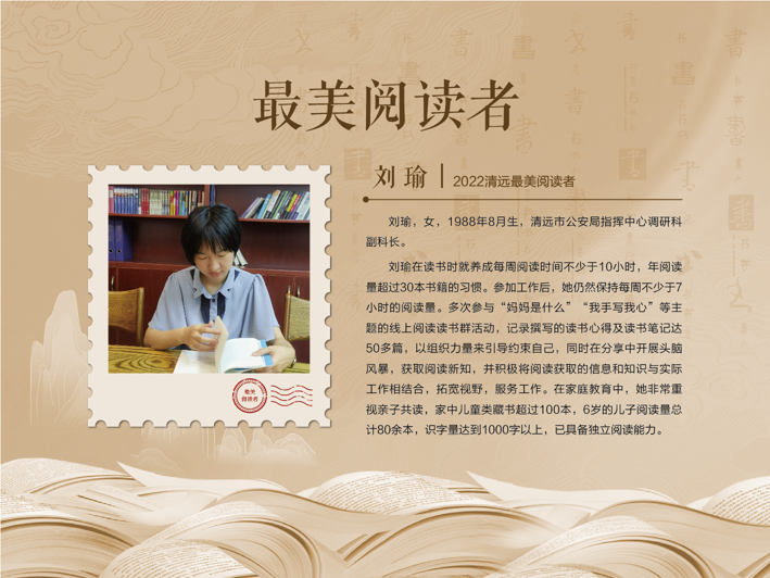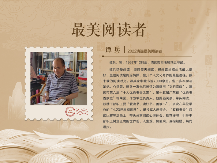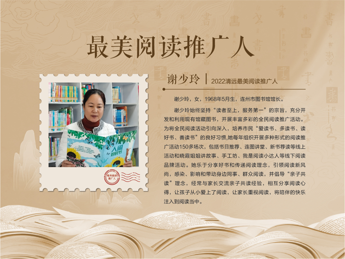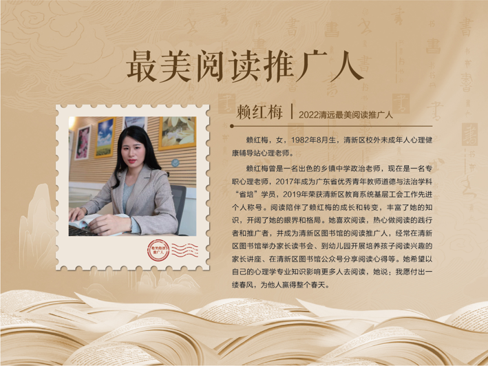 近年來,清遠(yuǎn)著力于推動(dòng)全民閱讀工作,打造書香城市。2022年,為結(jié)合創(chuàng)建全國文明城市的工作,清遠(yuǎn)市精神文明建設(shè)委員會(huì)辦公室、清遠(yuǎn)市文化廣電旅游體育局聯(lián)合在全市范圍開展“最美閱讀者”、“最美閱讀推廣人”推選活動(dòng)。在各縣(市、區(qū))、市直各單位、各地群眾積極推薦的基礎(chǔ)上,經(jīng)活動(dòng)組委會(huì)、各責(zé)任單位評(píng)選審定及資格審核,最終評(píng)選出9名最美閱讀者,9名最美閱讀推廣人。