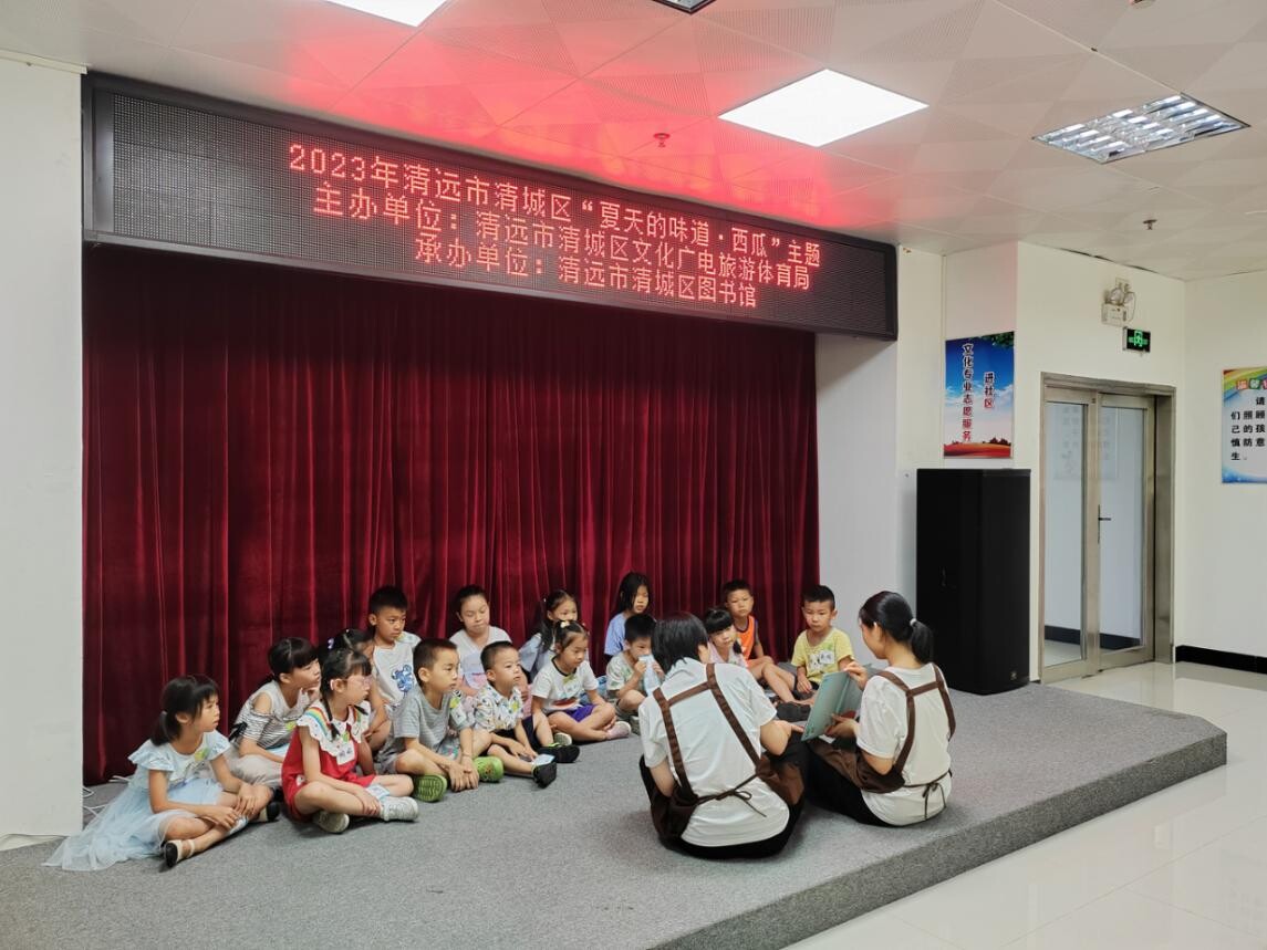 活動采取繪本《西瓜游泳場》是韓國新銳作家安寧達的作品,她的想象力里自帶一絲清新、涼爽的甜,翻著翻著整個人就像被冰鎮過了一樣,高溫帶來的郁燥都被撫平了,這本書里的字很少,一小半還是“沙沙沙”,“啪嗒、啪嗒、啪嗒”,“哈哈哈”,“撲通、撲通”這樣的象聲詞。可這些象聲詞,掉進清新得能擰出水來的圖畫里,就讓人覺得:哇,好萌啊!