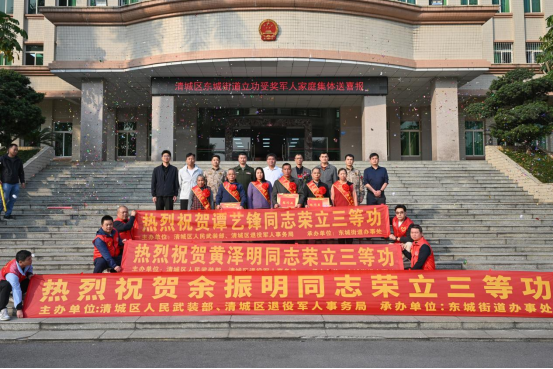 “矢志強軍建功業,情系桑梓送榮光。”1月19日,清城區退役軍人事務局聯合區人民武裝部,區司法局以及東城街道辦事處為譚藝鋒、余振明和黃澤明三位榮立三等功的現役軍人家庭舉行“東城街道2026年立功受獎軍人家庭集體送喜報儀式”,共同送上承載榮譽的喜報與衷心祝賀。