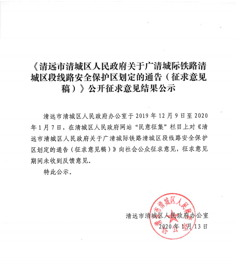 《清遠(yuǎn)市清城區(qū)人民政府關(guān)于廣清城際鐵路清城區(qū)段線路安全保護(hù)區(qū)劃定的通告(征求意見稿)》公開征求意見結(jié)果公示